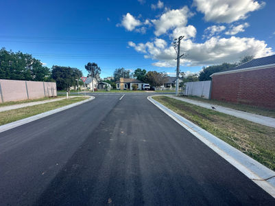 Road pavement construction, kerb and channel, RCP and pit install, electrical, comms, water and sewer installation works.